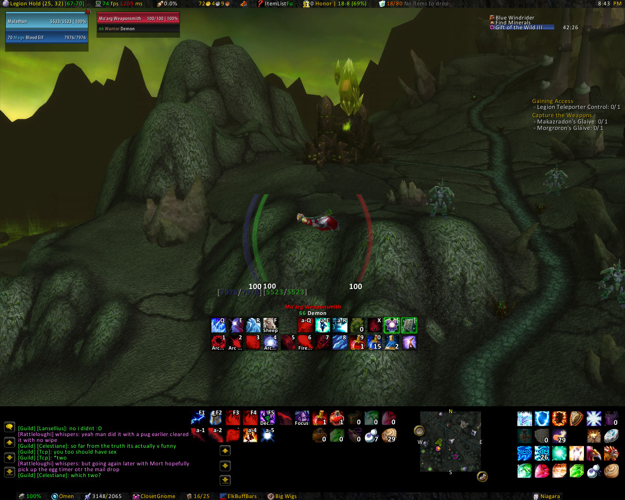 Yes, my lag has now gotten so bad I can actually swim through the sky. This is me swimming from Legoin Hold to Shadowmoon Village. Unfortunately the game caught up with me just as I was about to make a triumphant landing infront of what I suspect would have been a bewildered Rattle, and instead of swooping in like some sort of magical fish-bird I ended up plummetting to my doom and landing as a corpse behind him..