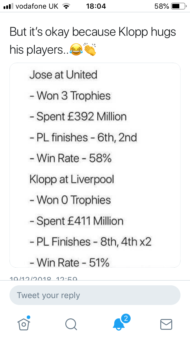 Stats are of course great for proving points on the internet, but you can't say we have been as successful as Liverpool have over the past few seasons at building a solid platform for future success. That is not about Klopp vs Mourinho strictly, it is more about the wider setup at both clubs. We have to adopt a more modern approach (and one that does not provide such ideal fodder for the tabloids), or we'll just continue our slide into mediocrity.