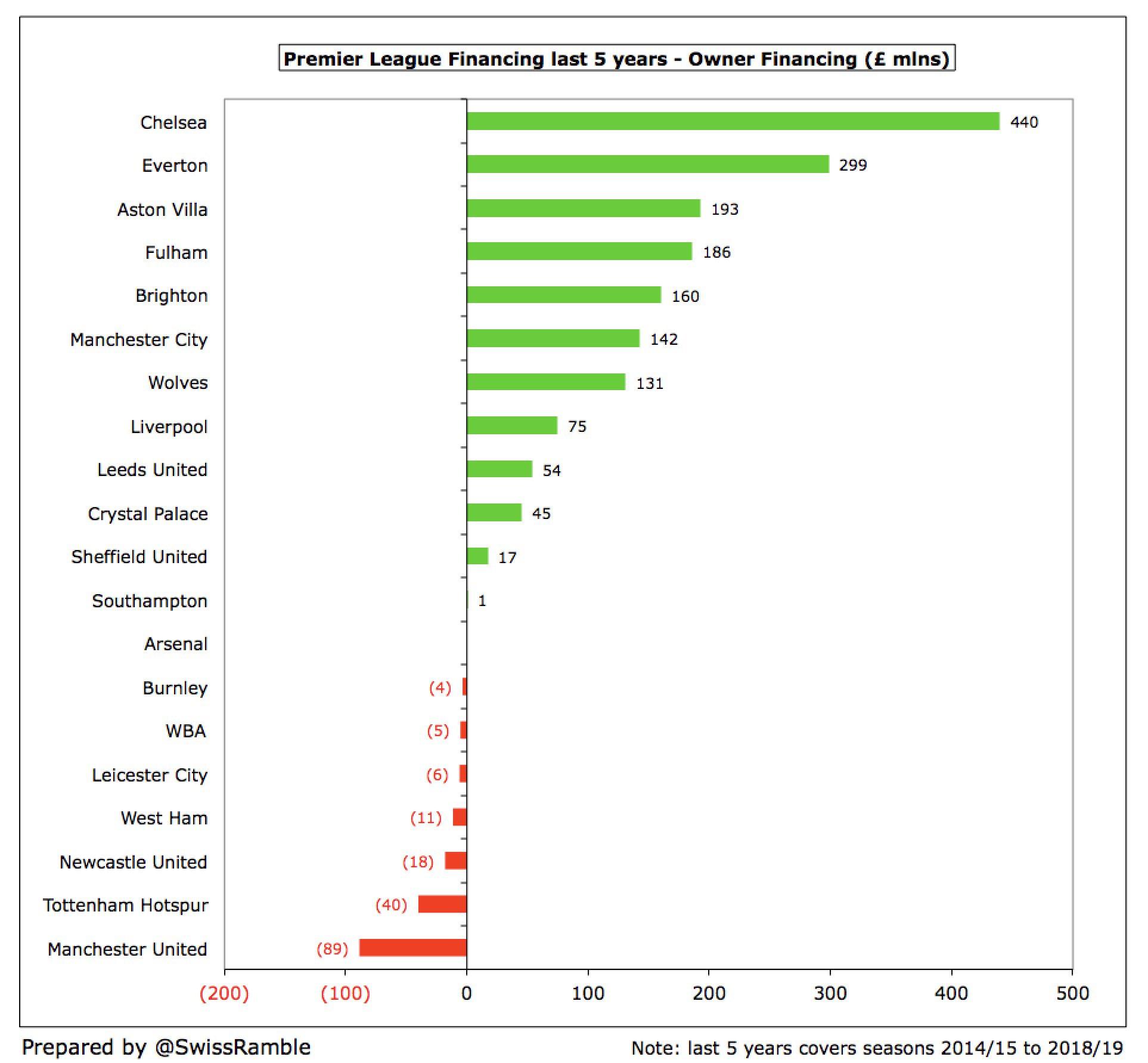 Here's a little graphic from the Swiss Ramble illustrating how much the various Premier League clubs' owners have put into their teams over the last five seasons.
