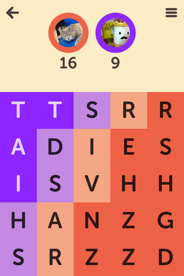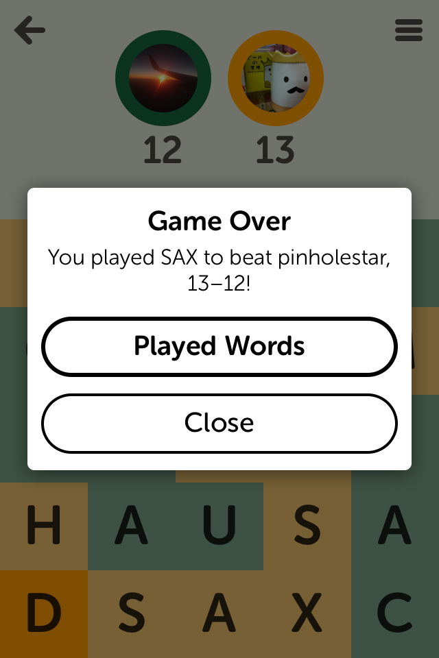letterpress could really do with a way to send your opponent a message either after each move or just after the game. I've had a couple of really good games where I'd like to send a little message after it finished. Oh well, one can always hope it'll arrive in an update.