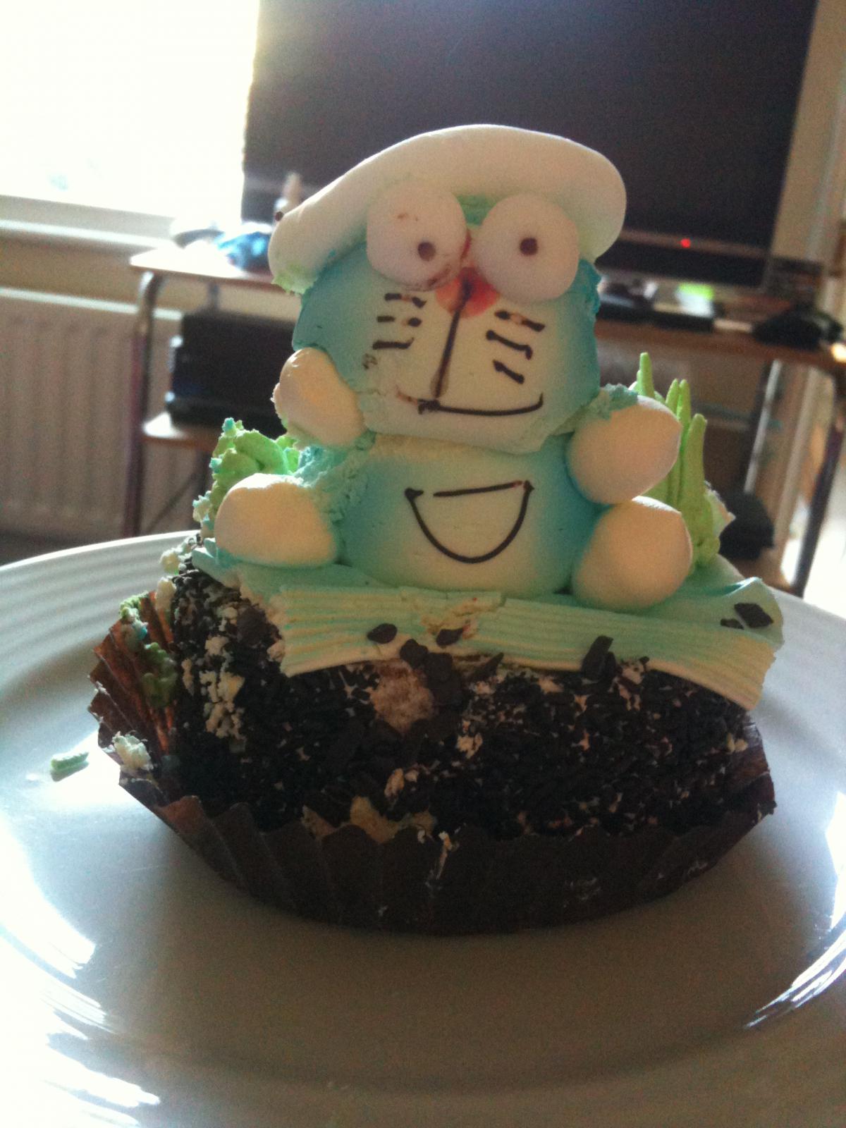 Doraemon is a robotic time travelling cat, who goes back in time to help out a little boy and they have lots of adventures usually with se sort of moral. It is quite fitting that he has a beret as the author was known to wear one himself :)