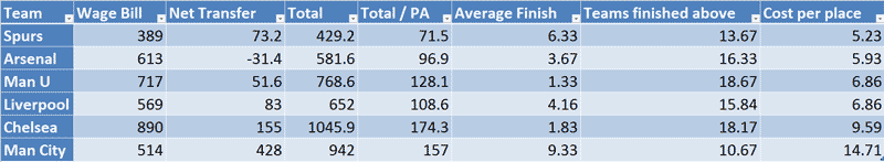 A few things are clear, there is a substantial difference between clubs in terms of expenditure versus Premiership finish. Spurs have spent less than half that of City yet finished three places higher, on average. In terms of analysis the clear issue with this information is it assumes the Premiership is a linear scale, which it isn't. Arsenal fans would argue the additional half million they've spent per place has been worth them finishing roughly three positions above Spurs with Champions league football and all that entails. Similarly ManU fans would claim the additional million per place they've spent versus Arsenal has enabled them to win the title four times in this period.