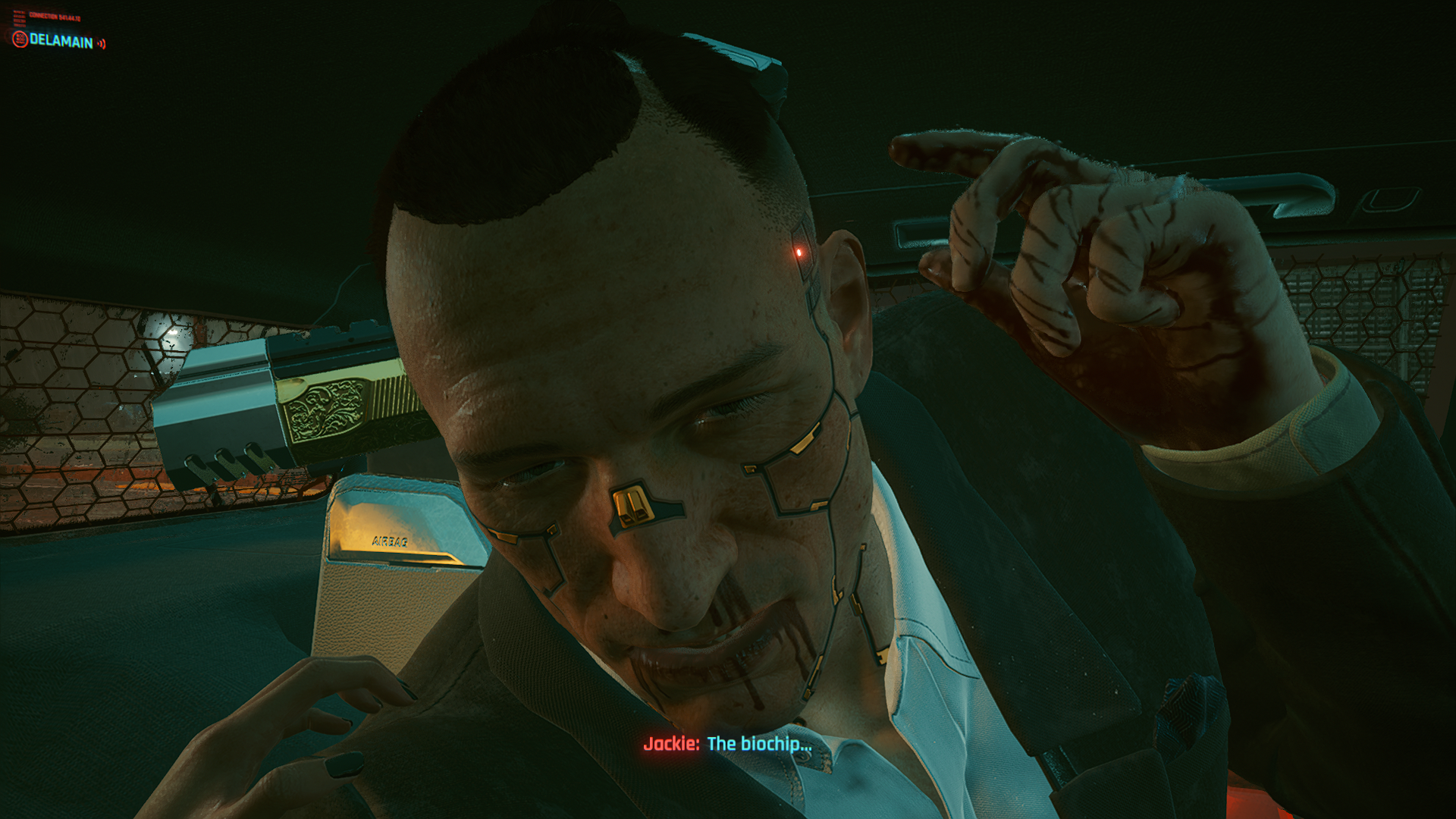 Jackie pushed his pistol right through his own head when he touched the biochip while he was bleeding out...