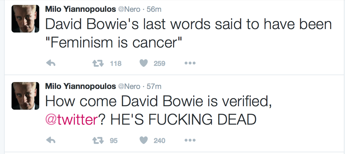 Twitter has taken Milo's Verified Account badget off him for rules violations (I don't know what, but he's been telling people abused by his followers that they should be abused on Twitter). Naturally this has lead to him writing a completely objective piece about how Twitter is all over and doomed and they're stupids anyway.
