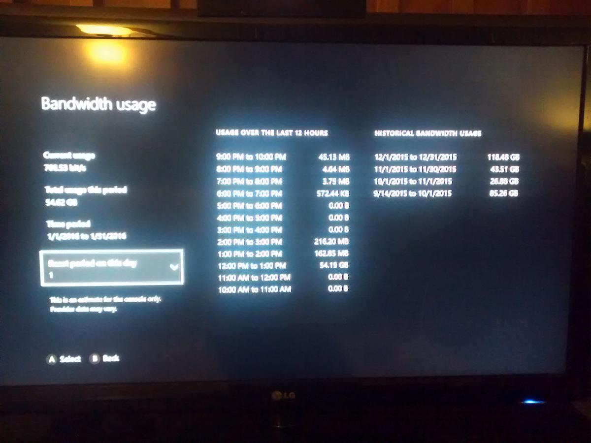 My connection (27mbps, according to the detailed network screen) is incapable of downloading 54gig in an hour, and besides I was sitting with my lad streaming thomas the tank engine from PBS. 1-2 was a bit of iPlayer and 2-3 Battlefront. Also, month to date is 54.6gig, and there's no way we've only used .5 gig in the 17 days prior to this.