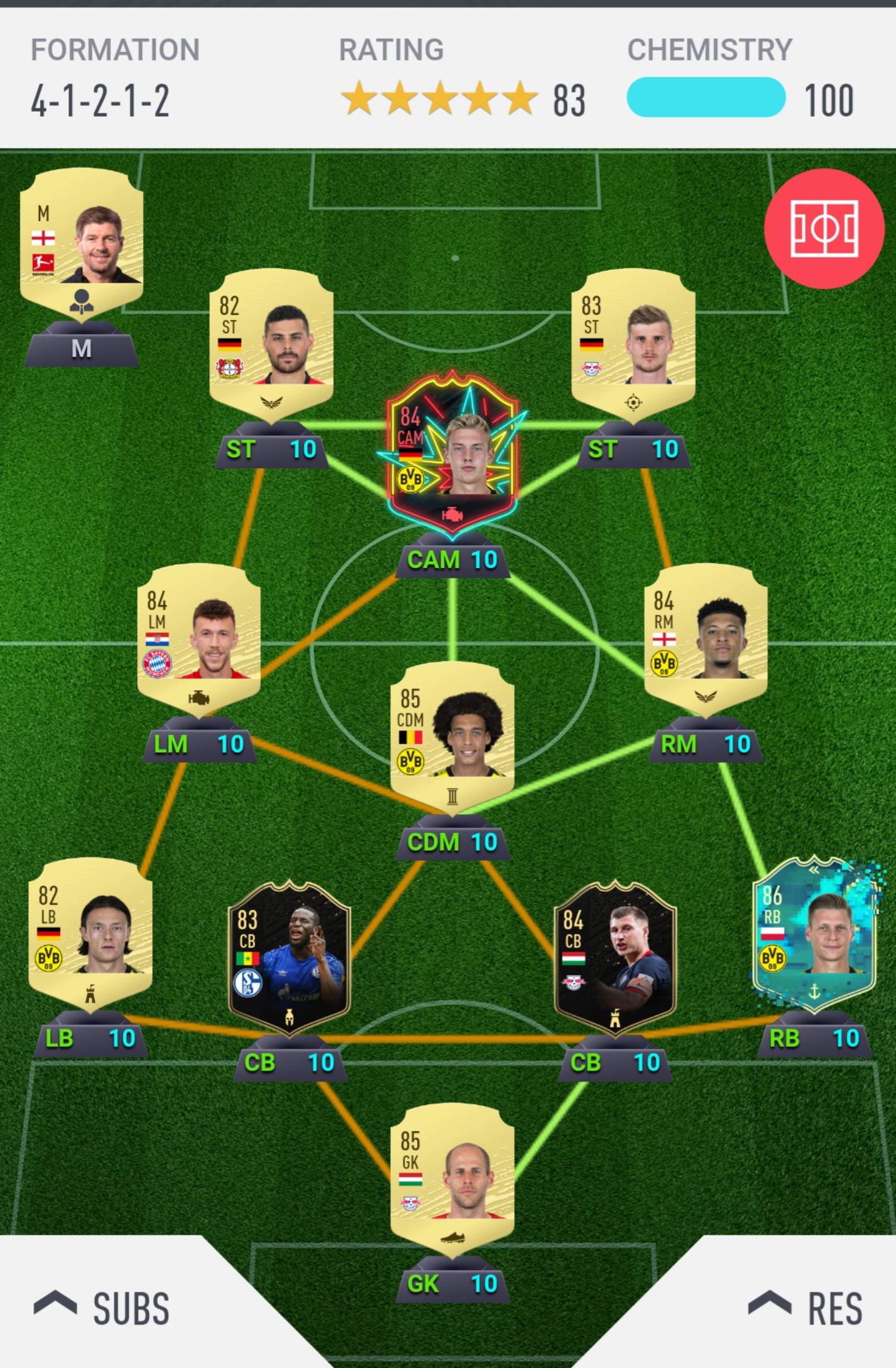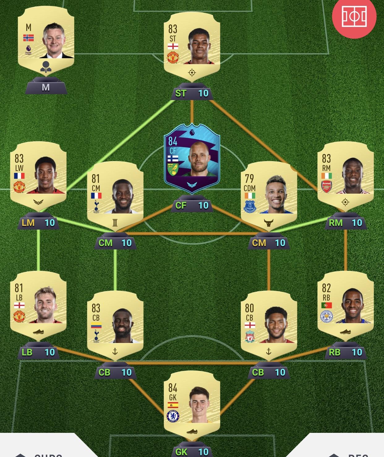 My team right now. I was going to sell Salah and Kane once the weekend league and BPL first owner icon tokens were done with, but I'm going to keep them, both have been great. I wasn't impressed with Pukki as a striker, but he works really well at CAM, and Lo Celso and Ndidi are both fine, if unspectacular.