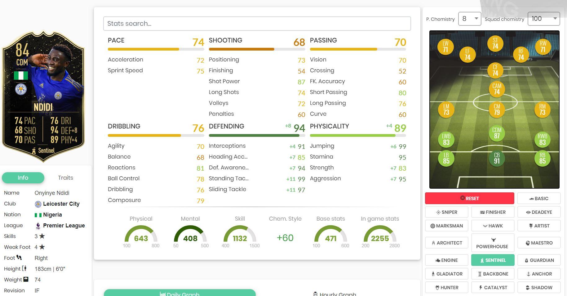 This is Ndidi's Futbin page (Futbin is a brilliant website that lists player prices, attributes, Traits, Chemistry boosts, Links and all manner of stuff).