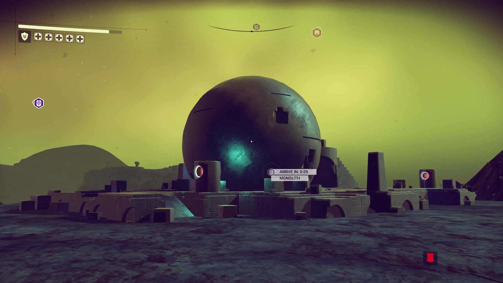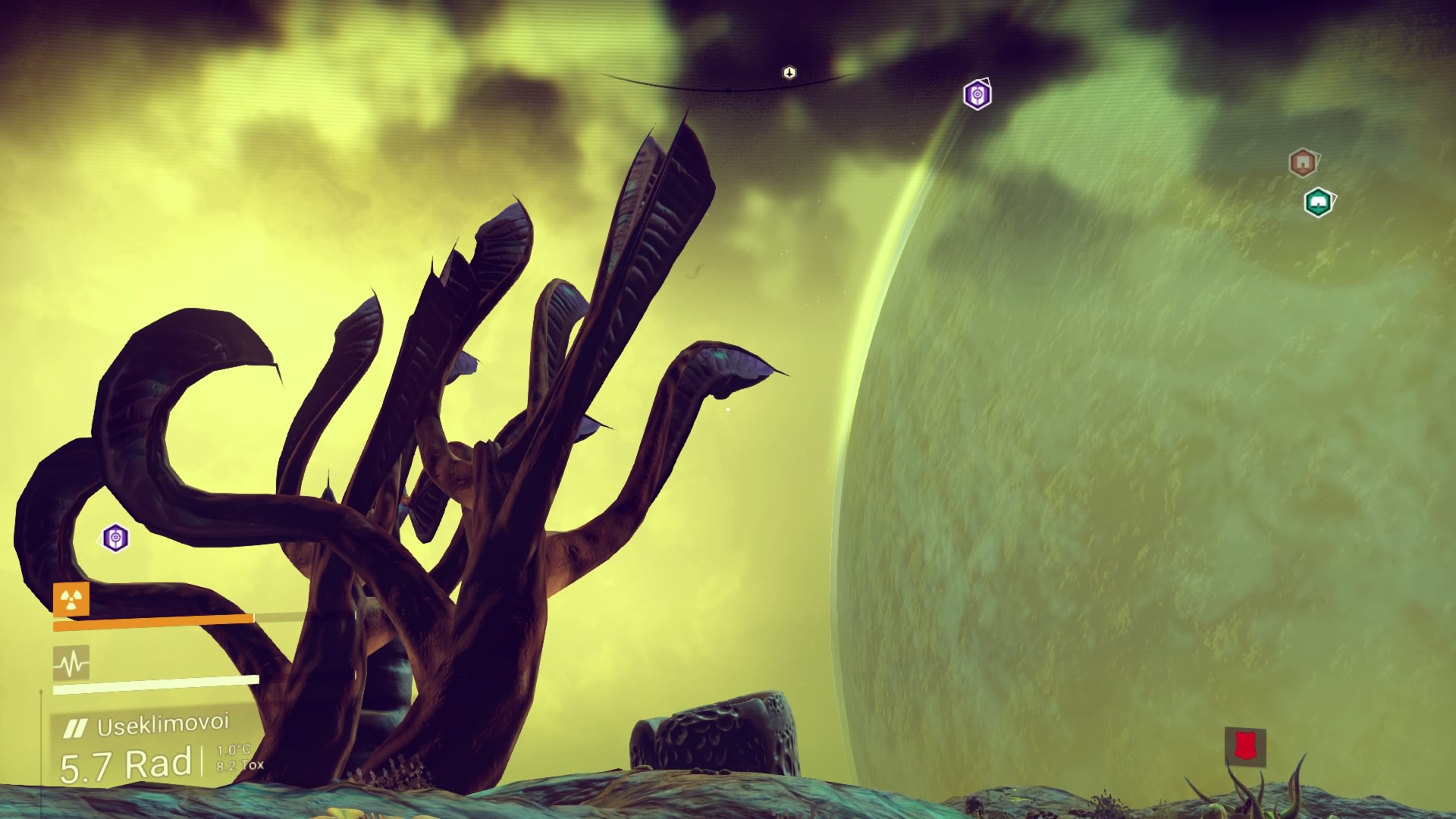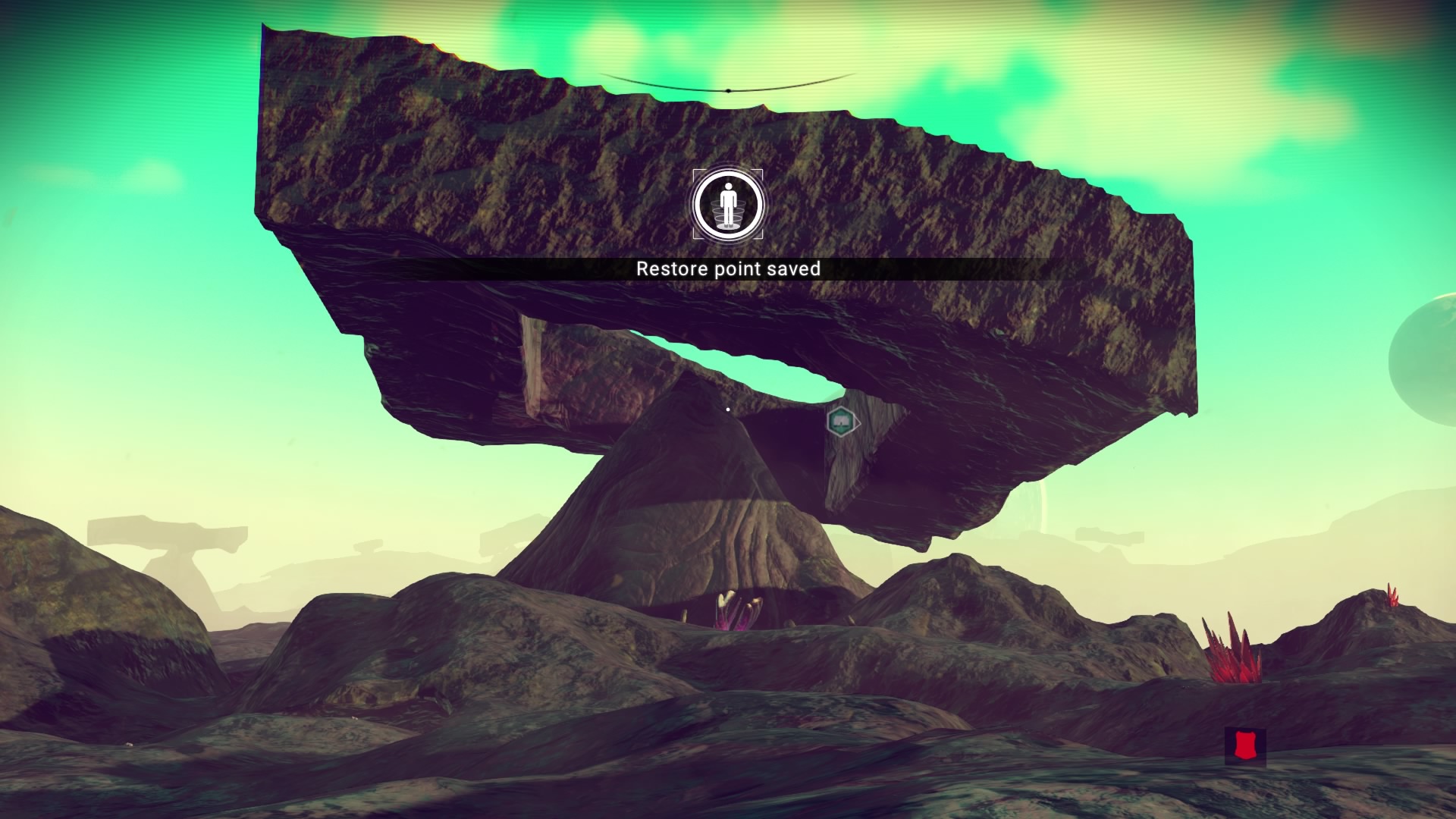 As the journey goes on, I think this might be it; where it all ends, out here in the red nothing. I'm so far away from my goal the icon is in the floor - it's on the other side of the planet! To break the monotony I farm shards to keep me alive and activate the waypoints along the way. I must have done 15, and got the 100% scan trophy as there was zero life on this rock.