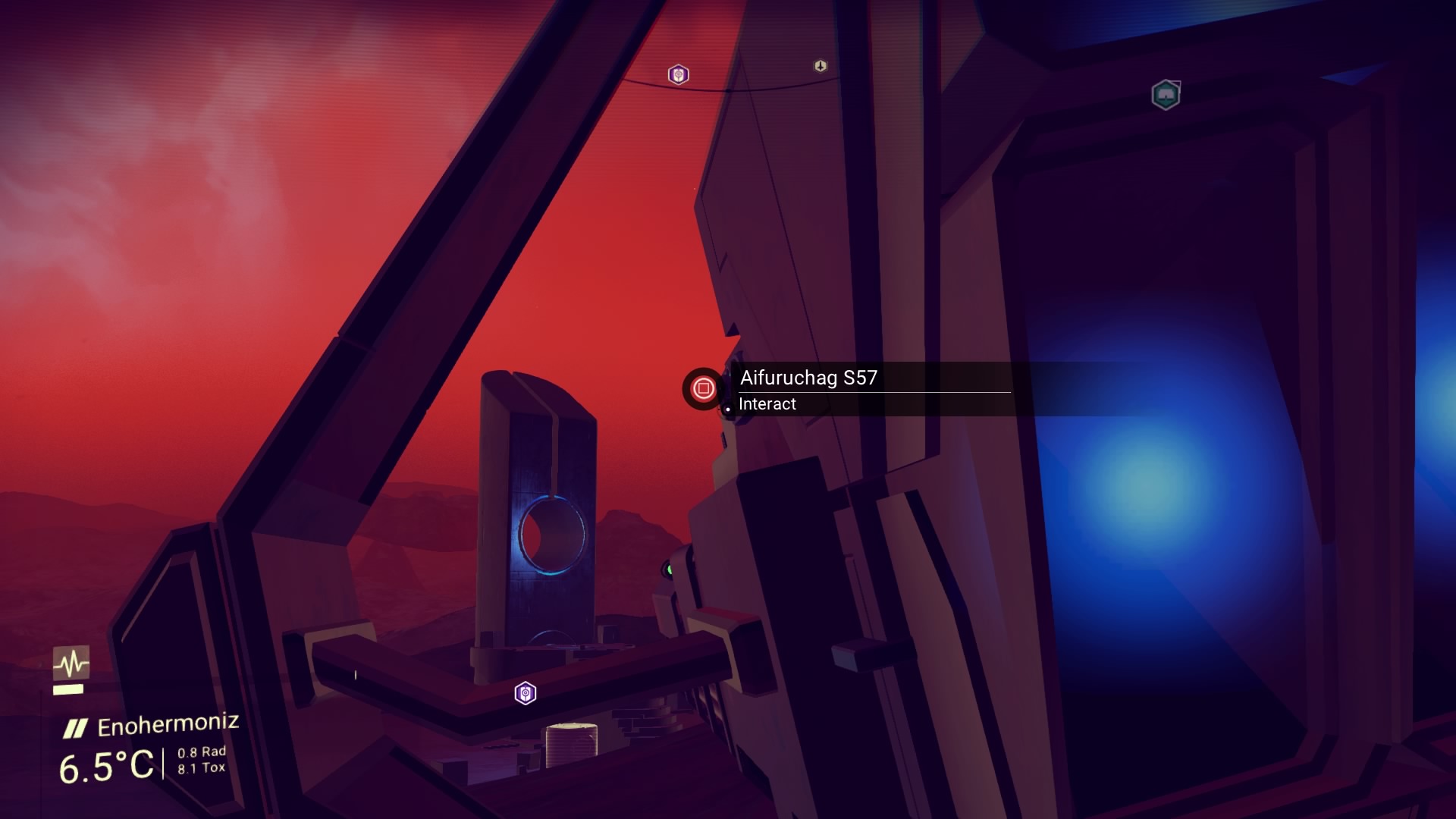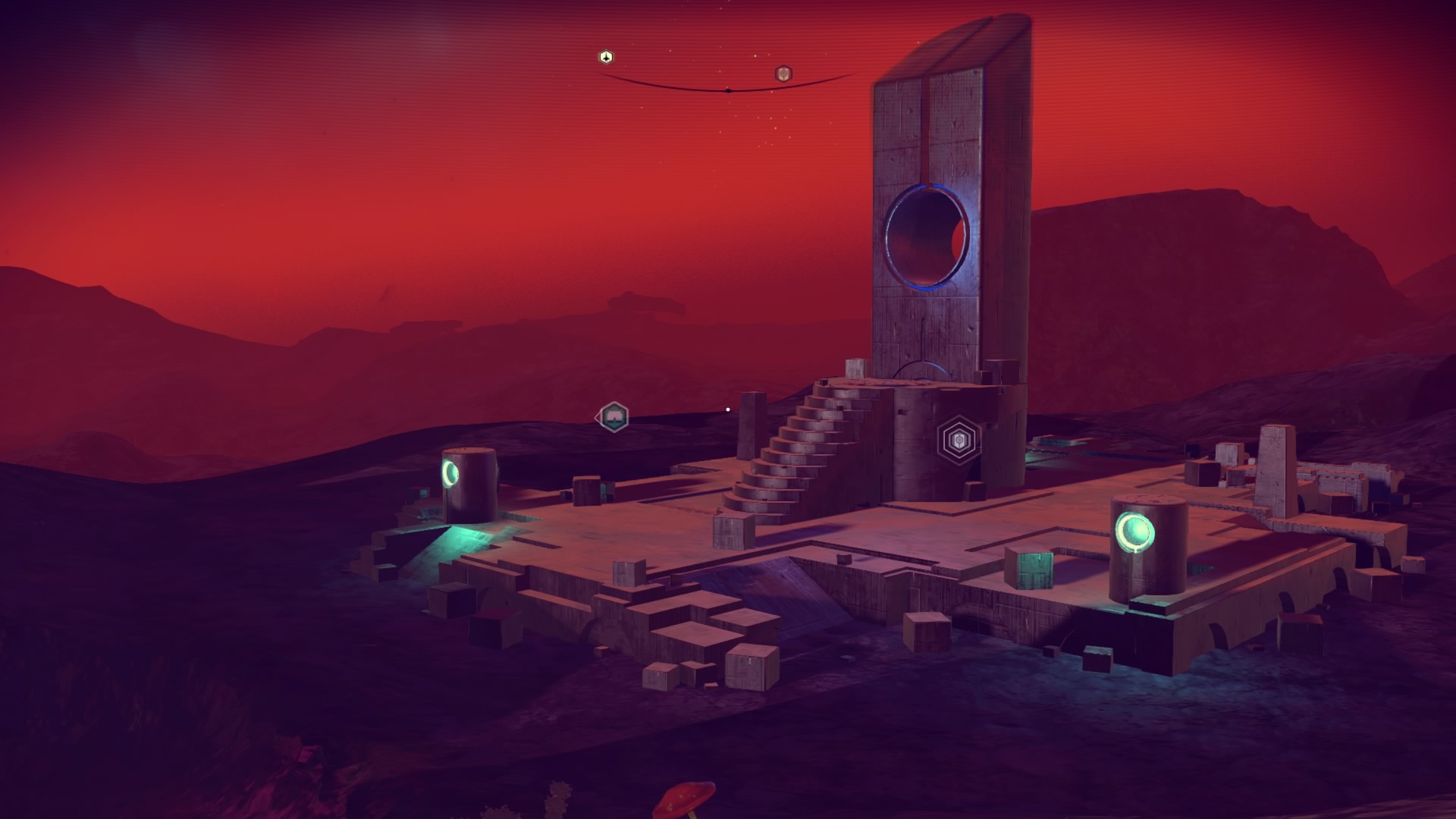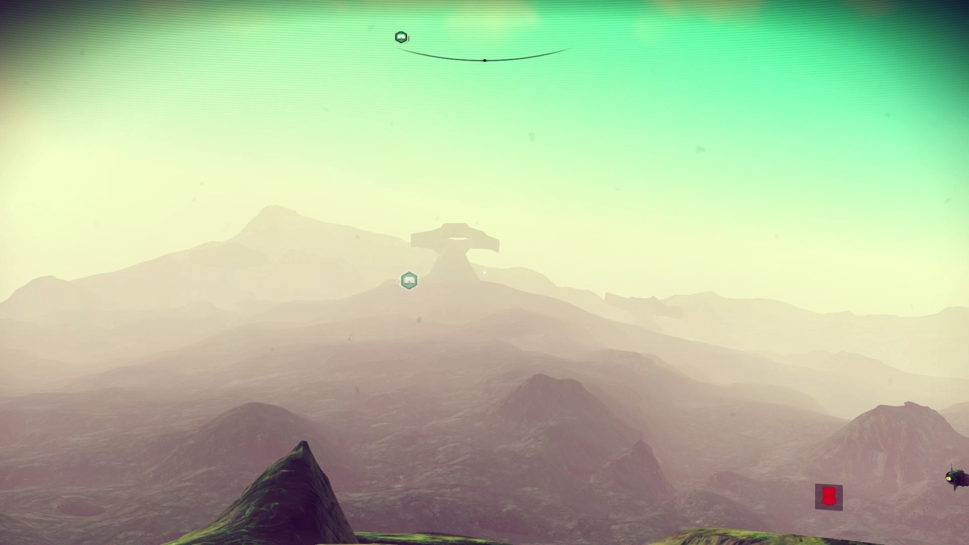 As the journey goes on, I think this might be it; where it all ends, out here in the red nothing. I'm so far away from my goal the icon is in the floor - it's on the other side of the planet! To break the monotony I farm shards to keep me alive and activate the waypoints along the way. I must have done 15, and got the 100% scan trophy as there was zero life on this rock.