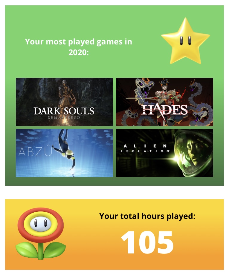 Was briefly confused by the lack of Paradise Killer here, then remembered I almost entirely played that using a guest account (demo'd it to my bubble-mate on a separate profile to avoid losing track of my actual save, only for us to get hooked on it as a co-op crime-solving experience and so ploughing through on that profile).