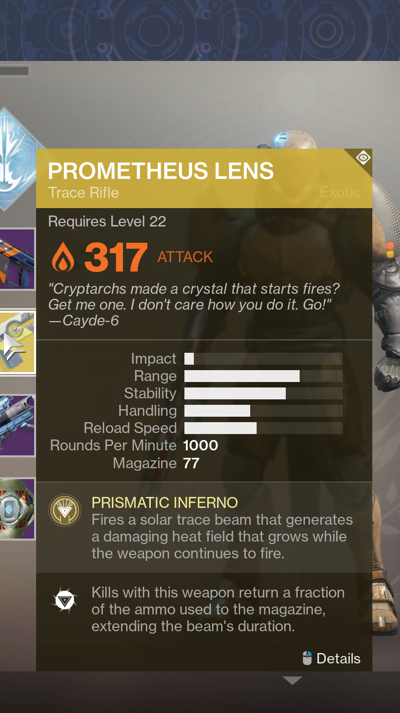 Slowly gearing up. I really like the hand cannon you can get from Ikora, it has some nice synergy with devour since a melee kill gives you four bullets back. I was using a nice new fusion until I got a 311 Hawthorne's from an engram, though I was bored of that gun already so I'll be ditching it as soon as I can.