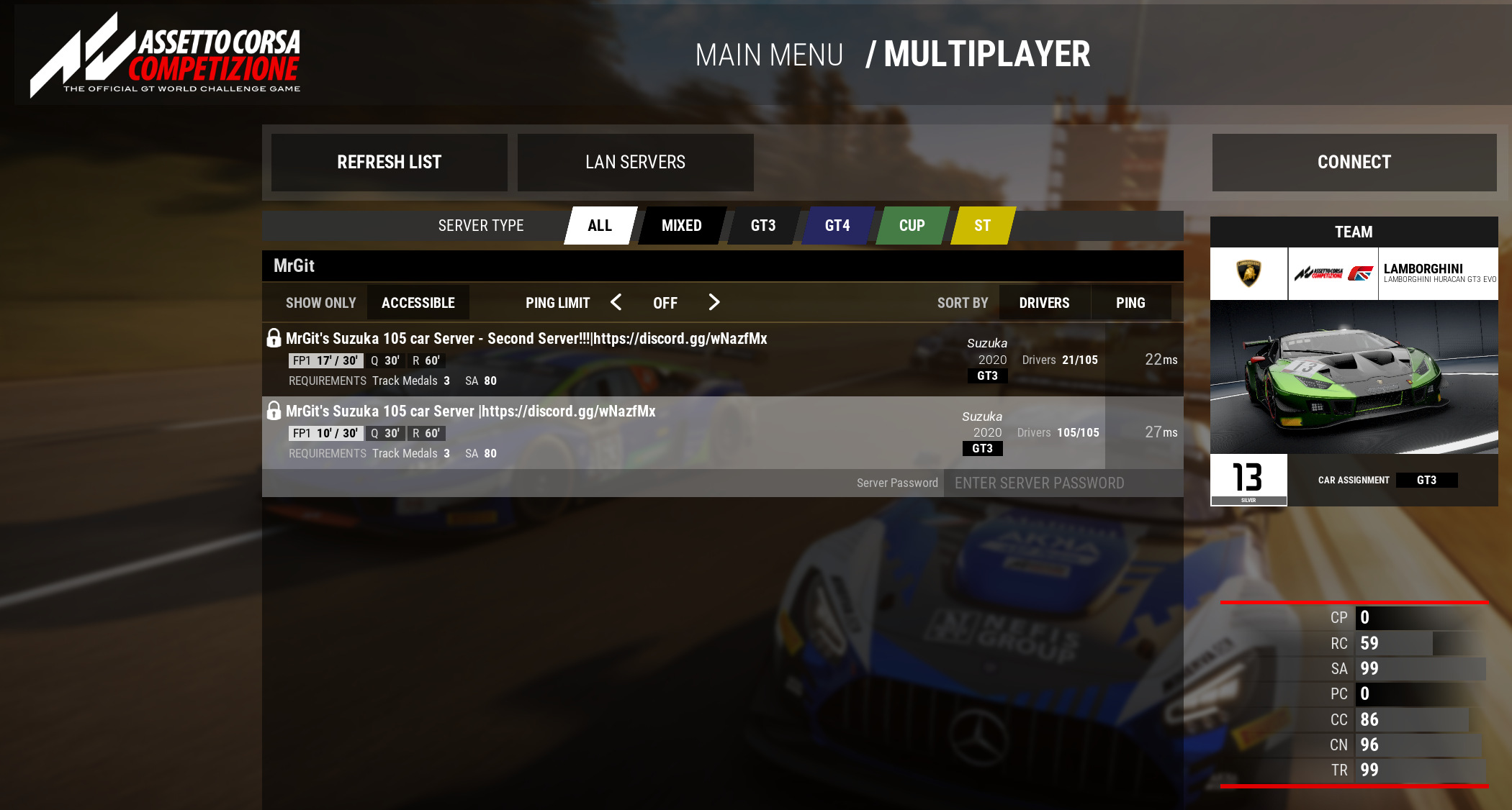 "Everyone is welcome to join, you need an SA level > 80 / 3 Suzuka track medals, search for "MrGit" ingame for the server.