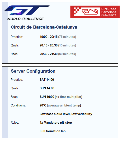 For the benefit of the new guys; the GT3 Endurance races are 60 minutes long with 1 mandatory pitstop (for fuel and/or tyres) with a full formation lap.