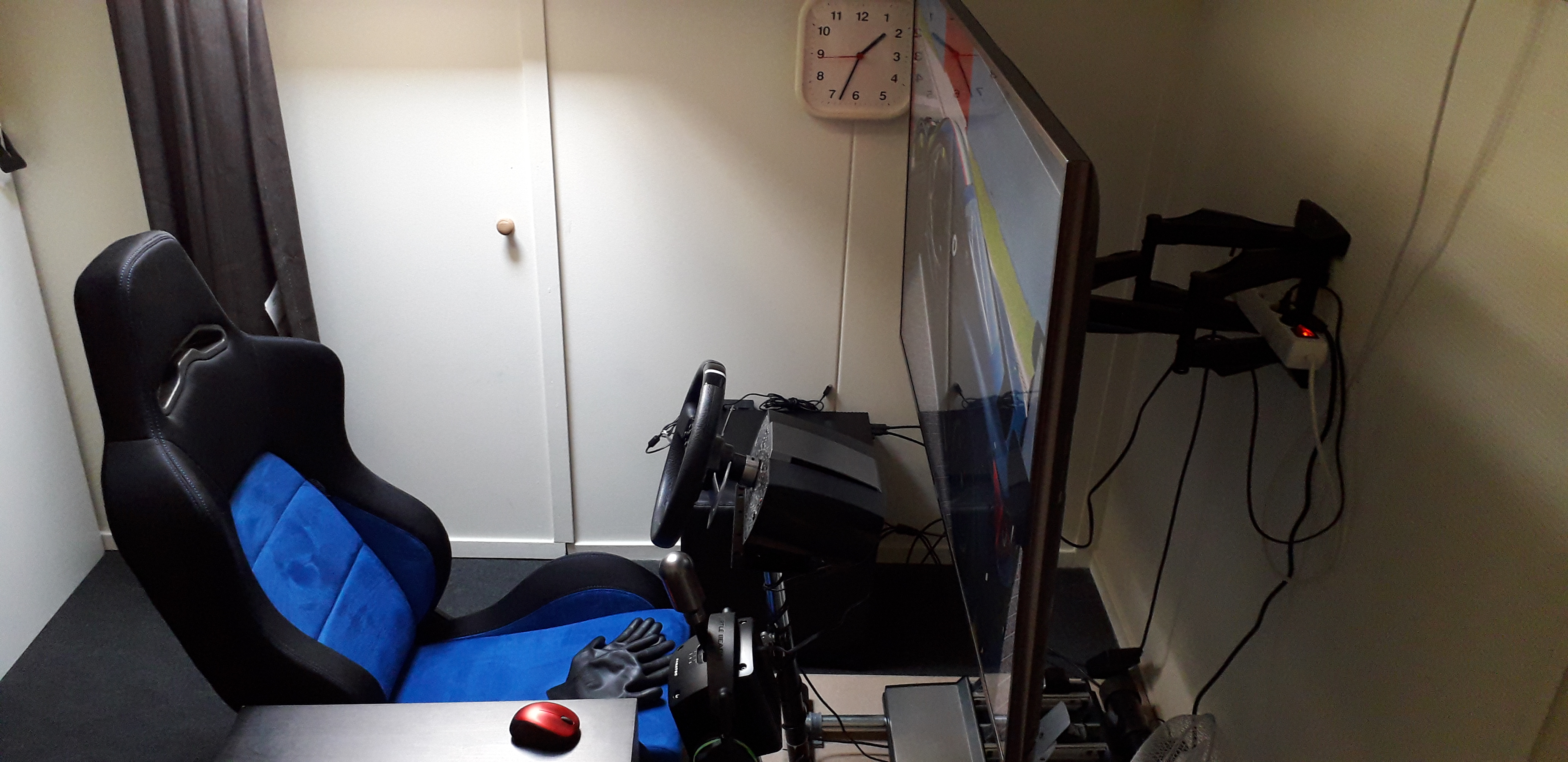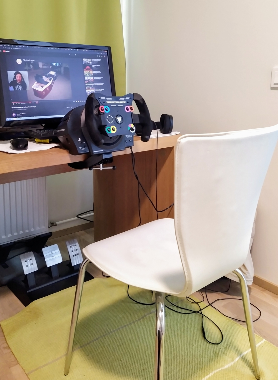 That's an old pic as I've since adjusted it so that the wheel base touches the screen. Distance from eyes to screen is 80cm.