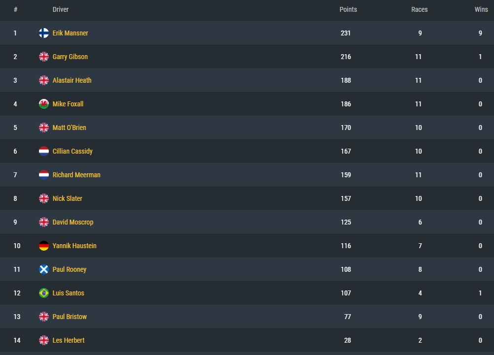 Congratulations to @Erik - a very well deserved win. We all know my 2nd place is only down to the fact I took part in all the races and not raw speed - but to echo @Valver's sentiments, I'll take it!